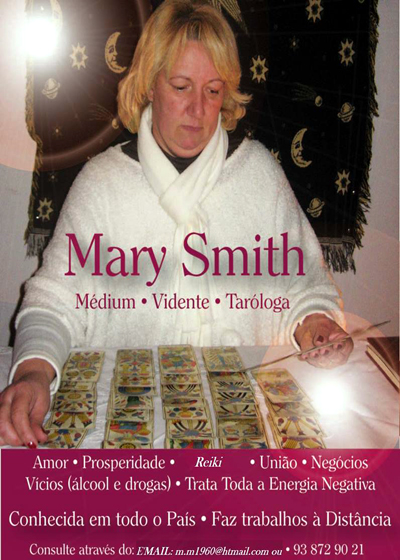 Sobre Mary Smith Guia de Luz Espaço de Tarot no Montijo, onde o seu Bem Estar ganha nova Vida. A taróloga Mary Smith realiza todos os Velões para cada Ritual pessoalmente! Especialista em Tratamentos Espirituais com Búzios e Tarot! Trata de Magias Negras, Pragas e Maldições! Recupere o seu Bem Estar! Ouça-a às 3ª feiras na Popular FM (90.9 MHz) das 14:00 às 14:30 e melhore a sua Vida! |